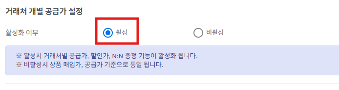 ③ [거래처별개별공급가설정]을 [활성] 시켜 줍니다.