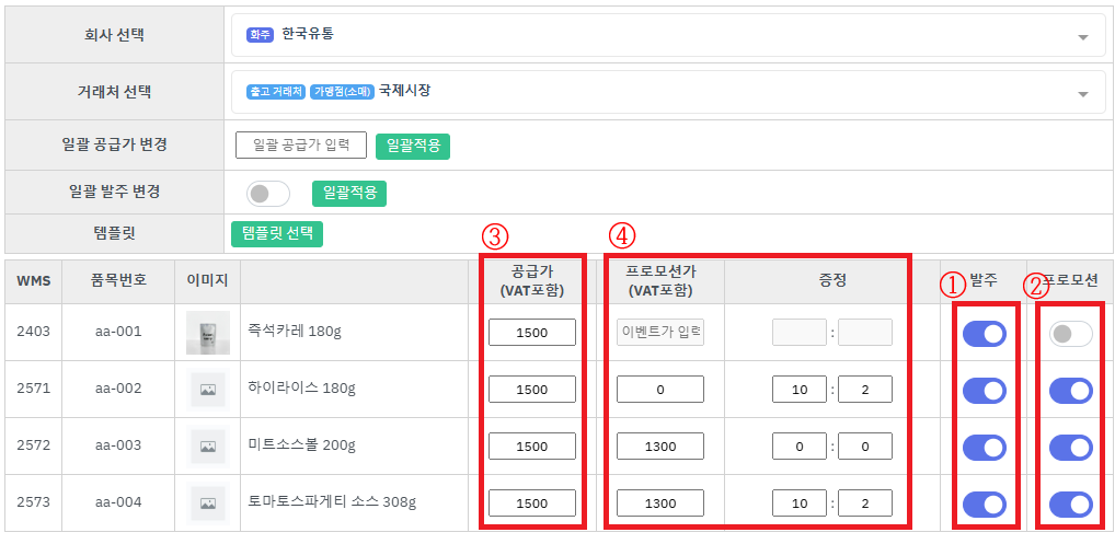 ④ 프로모션가격 및 증정비율을 기입합니다.