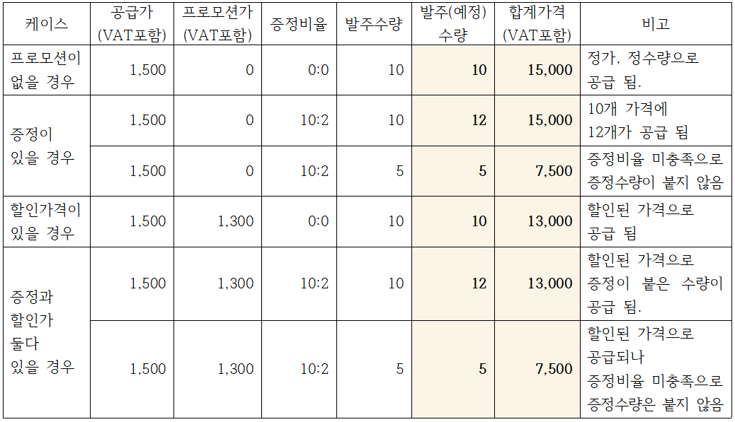 프로모션 가격과 증정비율을 기입하면 발주수량 입력단계에서