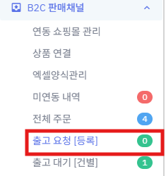 ① 왼쪽메뉴 [B2C판매채널] => [출고요청(등록)]를 클릭합니다.
