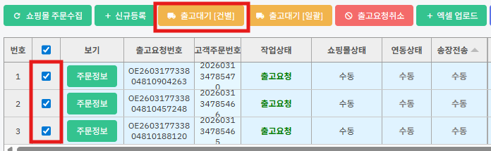 ③ 출고하고자 하는 주문서를 체크하고 [출고대기(건별)] 버튼을 누릅니다.