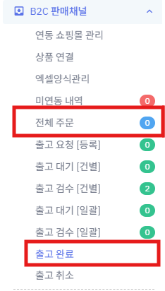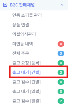 ① 왼쪽메뉴 [B2C판매채널] => [출고대기(건별)]을 클릭합니다.