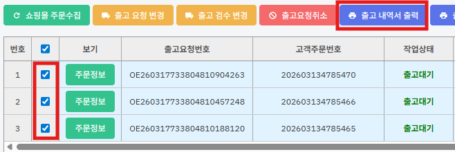 ② 리스트의 주문 건을 체크하고 [출고내역서출력] 버튼을 누릅니다.