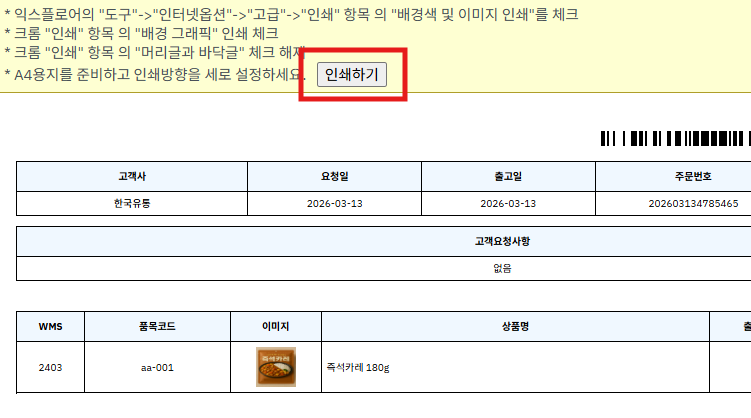 ④ [인쇄하기] 버튼을 눌러 주문서를 출력 합니다.