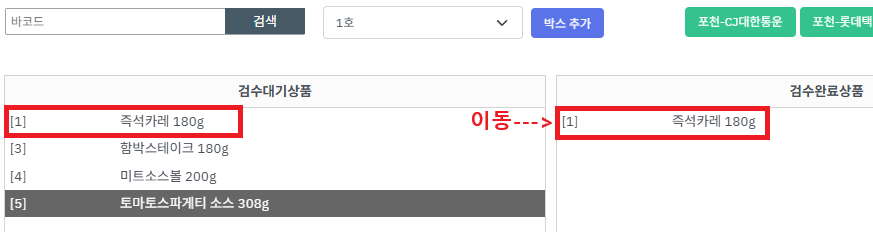 step2. 스캔 또는 수기입력으로 상품을 검수하면 선택된 박스에 상품이 담깁니다.