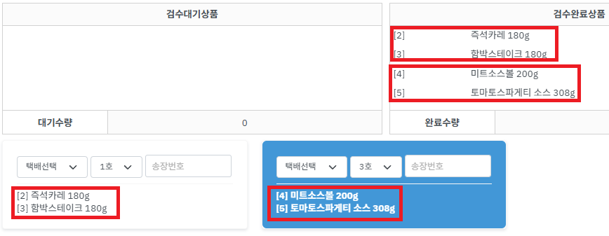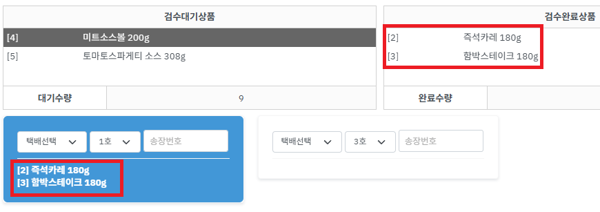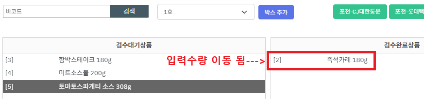 step3. 수기입력한 수량이 [검수대기]에서 [검수완료] 쪽으로 이동됩니다.
