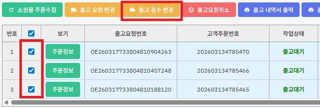 ⑤ 주문 건을 체크하고 [출고검수변경] 버튼을 누릅니다.