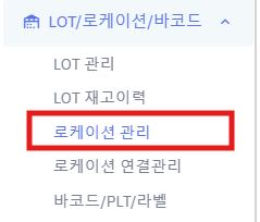 1) 왼쪽메뉴 [LOT/로케이션/바코드] => [로케이션관리]를 클릭 합니다.