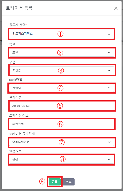 로케이션 구분이 모호 할 경우 [보관존]을 선택해 주세요.