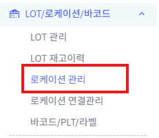 ① 왼쪽메뉴 [LOT/로케이션/바코드] => [로케이션관리] 를 클릭 합니다.