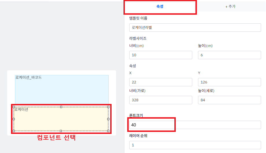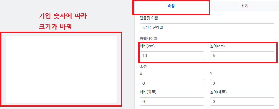 ⑤ [속성] 탭에서 라벨사이즈를 기입합니다.