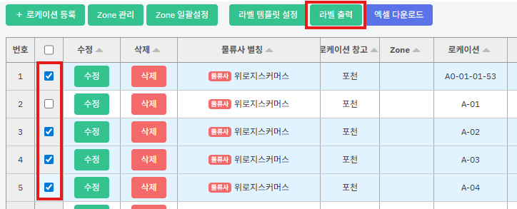 ① 출력하고자 하는 로케이션을 체크 후 [라벨출력] 버튼을 누릅니다.