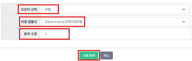 ② [프린터], [템플릿] 을 선택하고 [수량기입] 후 [라벨출력] 버튼을 누릅니다.