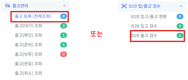 또는 왼쪽 메뉴 [B2B입/출고검수] => [B2B 출고검수] 를 클릭합니다.