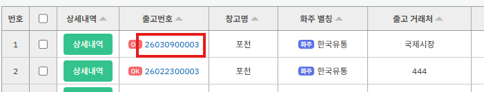 ② 리스트에서 출력하고자 하는 주문건의 [출고번호]를 클릭합니다.