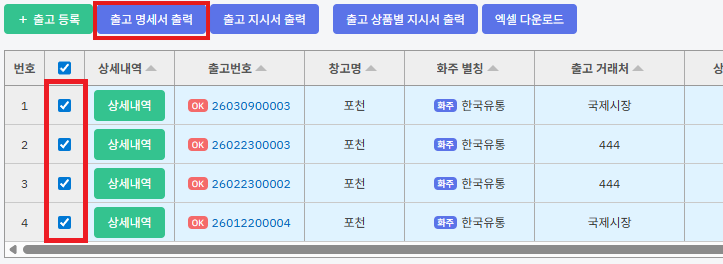 리스트에서 해당 건을 체크하고 [출고명세서] 버튼을 누릅니다.