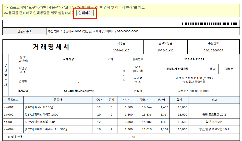 출고지시가 완료 되면 명세서를 출력 할 수 있습니다.