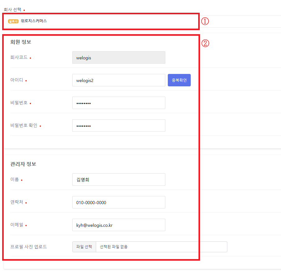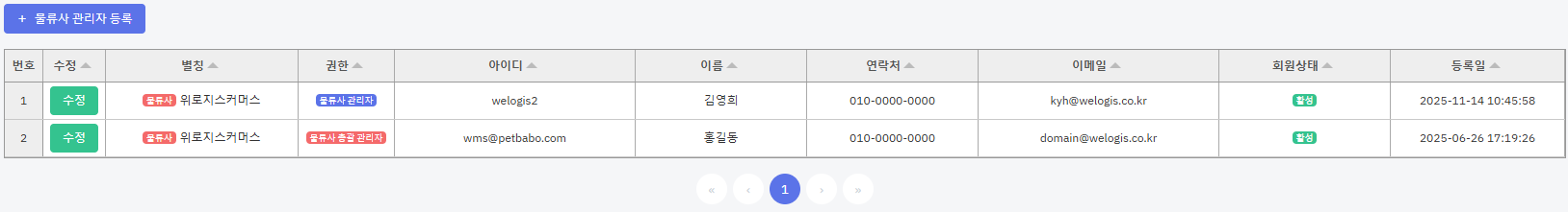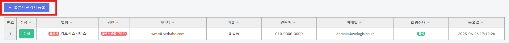 3) [+물류사관리자등록] 버튼을 누릅니다.