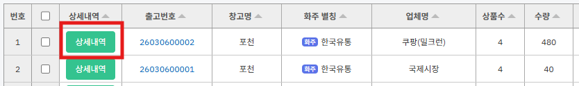 ② 해당 출고건의 [상세내역] 버튼을 누릅니다.