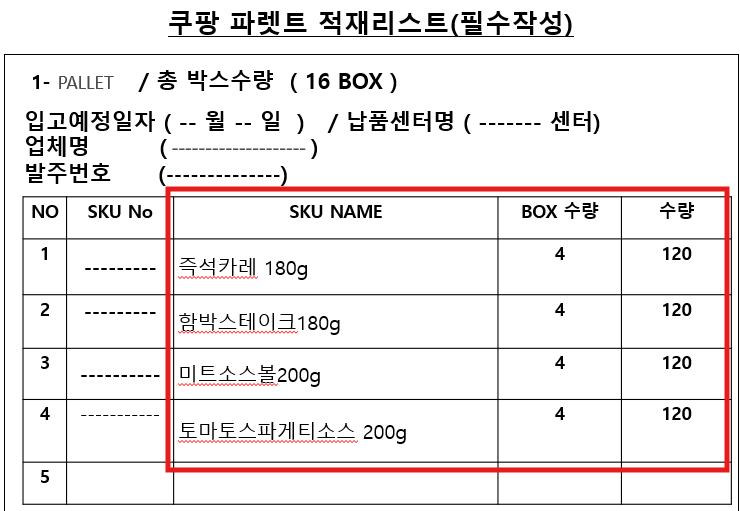 ① 출력한 [쿠팡서류]의 상품, 출고수량, 혼적여부를 확인하고 작업계획을 수립합니다.