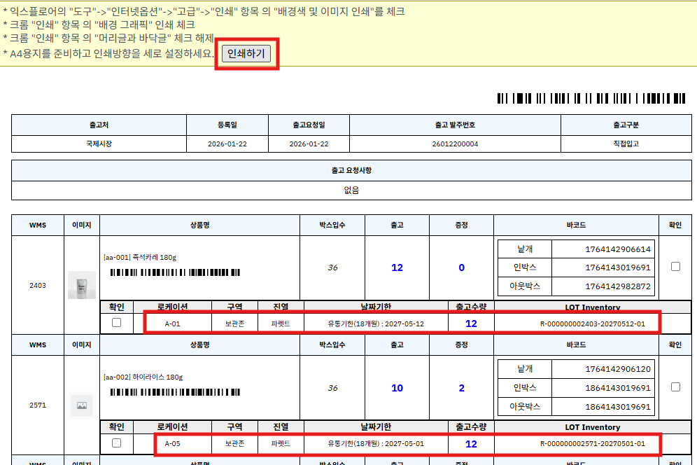 ④ 지시서의 로케이션과 출고수량을 확인하고 상품을 준비(피킹) 합니다.