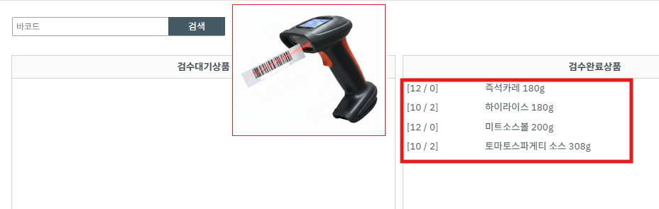 ③ 바코드를 스캔할 때 마다 상품이 1개씩 [검수대기]에서 [검수완료] 쪽으로 이동됩니다.
