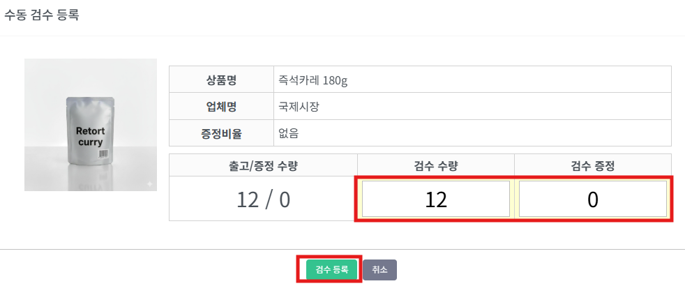 ⑥ 수기입력창이 나오면 검수수량을 기입하고 [검수등록] 버튼을 누릅니다.