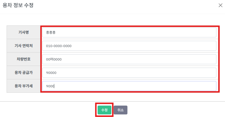 ② 용차정보를 기입하고 [수정] 버튼을 누릅니다.