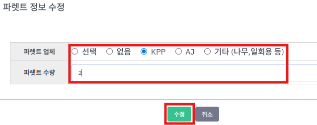 ④ 파렛트 정보를 기입하고 [수정] 버튼을 누릅니다.
