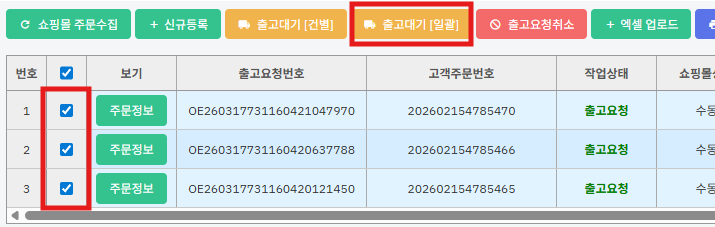 ③ 출고 하고자 하는 주문서를 체크하고 [출고대기(일괄)] 버튼을 누릅니다.