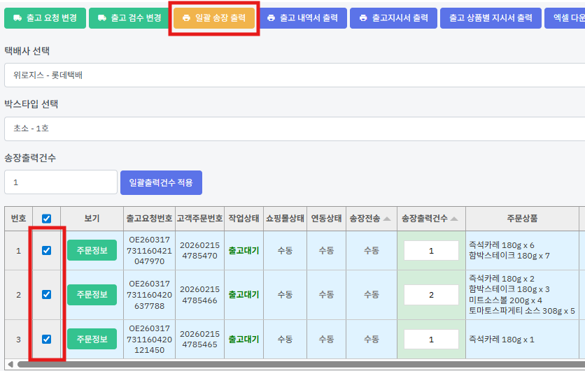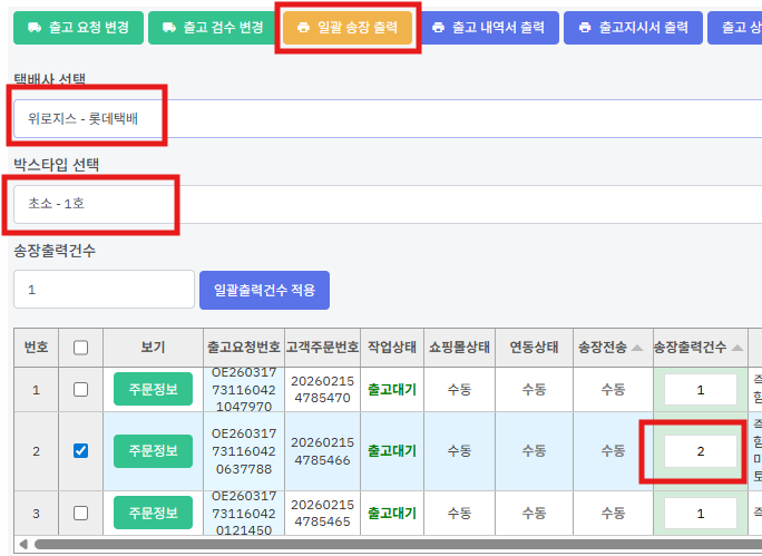 step4. [송장개수], [택배사], [박스타입] 을 선택하고 [일괄송장출력] 버튼을 눌러