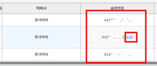 주문건에 2장 이상 운송장이 출력된 경우 송장번호 옆에 (숫자) 로 표시 됩니다.
