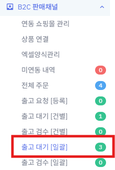 ① 왼쪽메뉴 [B2C판매채널] => [출고대기(일괄)]을 클릭합니다.