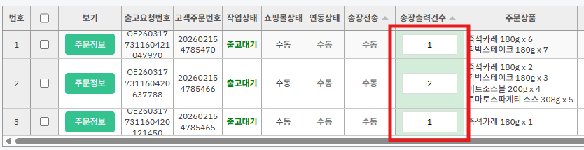 ② 리스트의 주문 건에 송장출력 개수를 기입 합니다.
