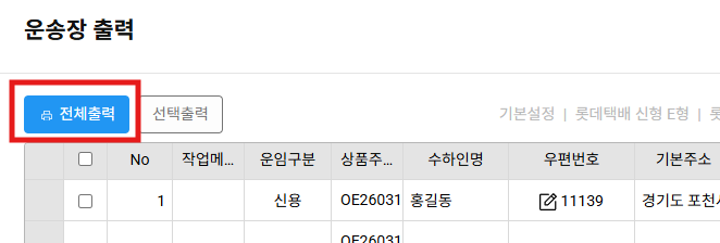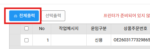 ※ 송장일괄 출력은 출력도중 용지 걸림 등 장애가 발생할 것을 감안 하여