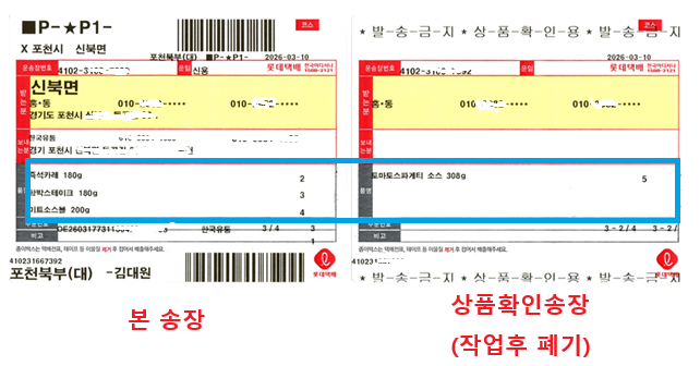 ※ 연결되어 나온 [상품확인용] 운송장은 발송 용도로 사용 할 수 없습니다.