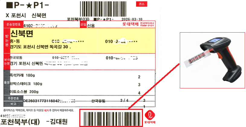 또는 [검수바코드-택배사명] 을 스캔 합니다.