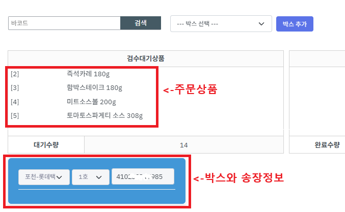 step5. 화면하단에서 추가된 박스와 송장번호를 확인 합니다.