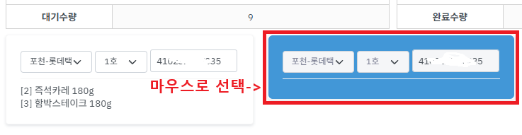 step1. 주문리스트 하단 스크롤을 오른쪽으로 옮기면 주문별로 출력된 송장 번호를 확인 할 수