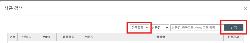 ④ 상품검색 창에서 [화주] 선택후 [검색] 버튼을 누릅니다.