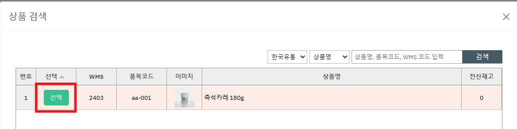 ⑤ 화주에 속한 상품들이 조회 됩니다. 원하는 상품의 [선택] 버튼을 누릅니다.