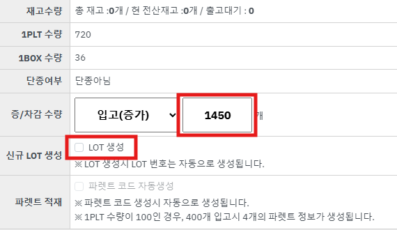 ※ 재고등록 수량을 1개의 인벤으로 관리할지, 파렛트 입수량으로 분할하여 관리할지