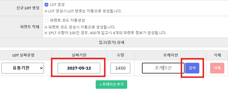 step3. 유통기한을 입력하고 로케이션 [검색] 버튼을 누릅니다.