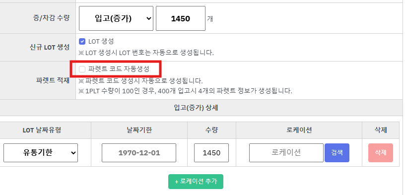 ※ 파렛트 코드자동생성 기능을 사용하지 않으면 등록 수량에 관계없이