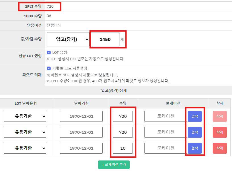 ⑨ 하단에 [유통기한], [로케이션] 입력필드가 나타납니다.