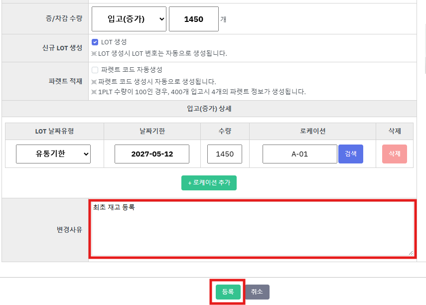 ⑫ 재고 변경 사유를 기입 후 [등록] 버튼을 누릅니다.