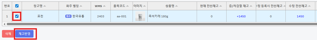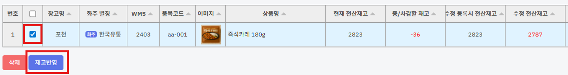 ⑨ 리스트에서 해당 상품을 체크하고 [재고반영] 버튼을 누릅니다.