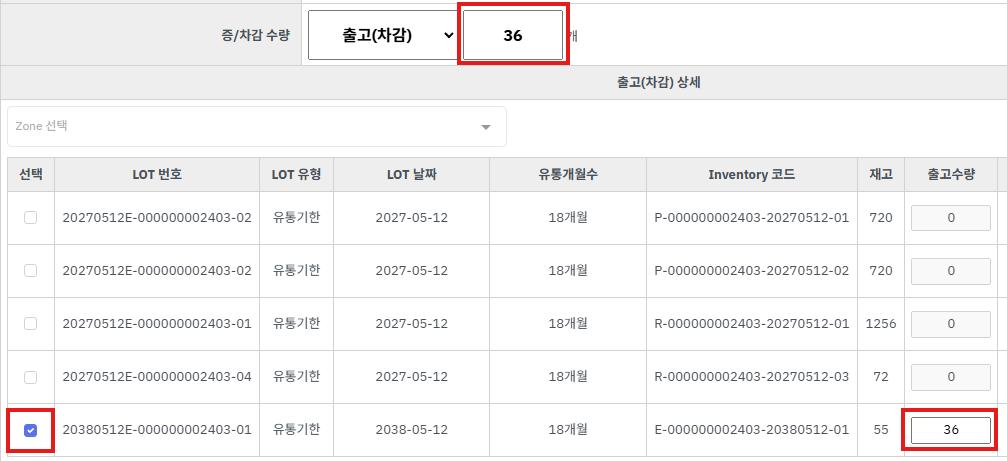 ⑦ 하단 [LOT 필드] 필드에서 차감할 LOT 을 선택하고 수량을 기입합니다.