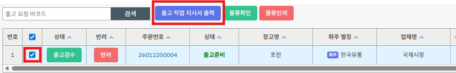 ① 해당주문서를 체크 하고 [출고작업지시서출력] 버튼을 누릅니다.
